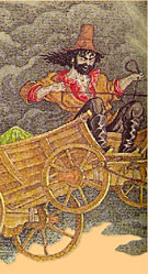 Изађоше они на пут. Гледа Циганка: стоји кочија са паром упрегнутих коња, али таквих коња какве она у животу видела није- грива им пламти а из очију искре севају. Седоше они у кочију. Зазвижда Циганин и коњи појурише.